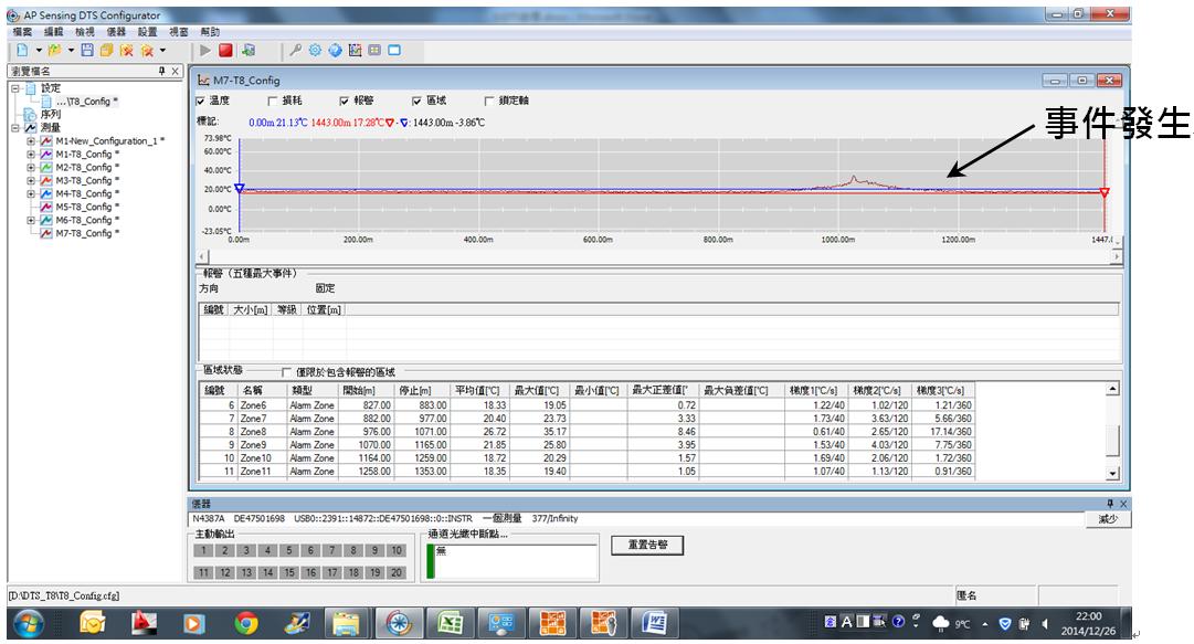 照片1為應用於台11線跳浪隧道實景,感測光纜沿隧道頂部進行架設,光纜尾端則連結至隧道機房內之光纖偵溫解讀系統,並利用圖控軟體(SCADA),如圖1以視覺化畫面,提供管理人員監控隧道內每一處溫度變化。當有異常狀況發生時,光纖偵溫解讀系統,會傳送訊號觸發消防受信總機,以避免災害事故擴大。相關應用也同時使在蘇花改東澳東岳隧道之火警監控系統。