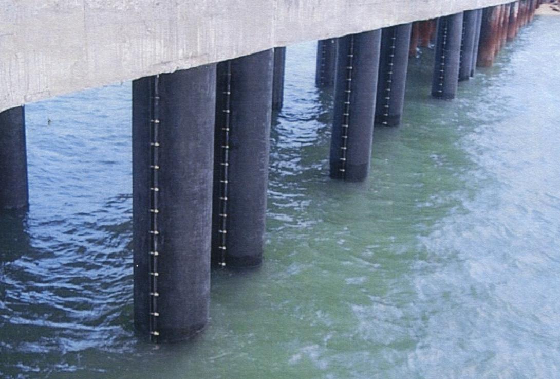 FRP保護套組合安裝要領:宜採用3㎜厚的FRP,兩片FRP對開寬度,必須能確保將鋼管樁環繞一圈,沒有外露間隙,且可以束緊為原則。FRP保護套兩側,依設計圖示間距,分別預留螺栓孔,先以50㎜寬之自黏性PVC膠帶,將包裹好的防蝕帶先行固定,然後將FRP保護套,緊貼PVC膠帶面,使用螺栓及螺帽旋緊。為防止FRP保護套受海浪而上下運動,FRP保護套上部需焊裝固定箍並塗防蝕材料,上端固定箍與混凝土底之間隙,則塗膜厚高之彈性防蝕被覆材料。