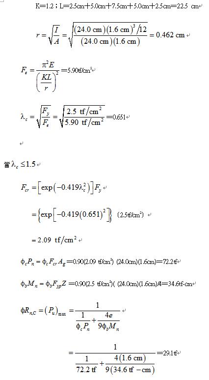 本例AISC Steel Design Guide 24第五章中之方形鋼管端部採用T型端板接頭設計例中採K=1.2,惟筆者認為連接端梁柱端,為梁柱交會之接頭區,其構架或桁架之面外勁度,隨桿件斷面之形狀而改變,並非可達彎矩固定端之程度,而大部分情況是偏向鉸接,且斜撑桿件在整體構架分析模型中,其端部一般係設定為鉸接,因此實際K值會介於0.65至2.1間。鑒於斜撐接合板一旦發生挫屈,會導致整體構架或桁架倒塌,其重要性是在整體結構成敗的關鍵位置,且考量接頭之邊界條件,應與結構分析模型所假設之邊界條件一致,筆者認為K值應取2為適當。另筆者所查閱之文獻資料亦指出,斜撑構架實體試驗結果與K取2之分析結果一致。因此筆者建議本題T型鋼腹板及接合板之挫屈強度之計算中,T型鋼腹板及接合板之K值,均應保守改取2。又若於T型鋼腹板單側增設加勁板,除可降底有效長度外,亦可減少接合板之偏心距,因而可大輻提高接頭之整體效益。