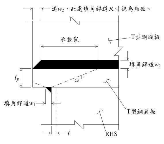 承載寬檢核:方形或矩形鋼管經由端板傳遞載重之方式,可依局部降伏及局部壓皺極限狀態計算其強度。集中力消散可假設為從承壓寛度二端,各以2.5:1的斜率分散傳遞(Wardenier et al.,1991;Kitipornchai 及Traves,1989)。根據上述假設,檢核局部降伏時鋼板之有效承壓長度為(5tp+tb)。若(5tp+tb)小於管寬B,則只有二側管壁寛度內之(5tp+tb)長度為有效承壓長度;若(5tp+tb)≧B,且矩形鋼管斷面之四管壁均被涵蓋在內時,此時依AISC 360-16第K章之規定,為四管壁全周為有效承壓長度;惟考量當(5tp+tb)=B之臨界尺寸時,其有效承壓長度可能會有數倍的差距,殊不合理,依端板厚度及其勁度觀之,並無法使方形鋼管四周均達降伏極限狀態。因此本例改用Eurocode 之建議:若(5tp+tb)≧B,且矩形鋼管斷面之四管壁均被涵蓋在內時,僅能取有效承壓長度=2(7tp+tb+2w),較合乎力學原理。