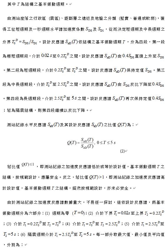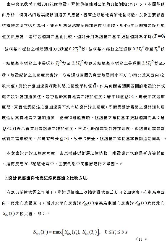 | 2018花蓮地震:測站紀錄及設計反應譜(上) 趙汶欣1、鍾立來1,2,3、林芃妤1、陳俊鴻1、何彥葳1、賴勇安1、楊卓諺2 1臺大土木系、2國震中心、3成大土木系 由鄰近災損的測站地震紀錄觀之,其中2018花蓮地震歷時紀錄具近斷層之特性,有別於一般設計反應譜,因此,有必要仔細分析地震紀錄反應譜。該地震紀錄反應譜之結果顯示,於週期一至兩秒附近之設計譜加速度值,有明顯低估真實地震紀錄之譜加速度,且週期落在中高樓建築物之基本振動週期範圍內。就現行耐震設計規範觀之,有低估真實地震之需求,故撰文探討之。 1.前 言 2018年02月06日23時50分41.6秒於花蓮近海,發生芮氏規模6.2地震,震央位於北緯24.1度,東經121.73度,深度6.3 km。此次花蓮地震造成花蓮市嚴重災損,四棟大樓倒塌,總計17人死亡;同樣地,2016年美濃地震、1999年集集地震,也出現類似情況,主要倒塌建物為1999年前興建之中高樓層建物。由2018花蓮地震勘查結果顯示,倒塌的大樓均有軟弱底層之缺陷,顯示既有建築物耐震容量不足 [1],需即刻進行對私有建築物的耐震補強 [2]。 除探討現有倒塌建物的耐震容量外,勘查結果也顯示倒塌建物,主要集中於米崙斷層附近,為了深入瞭解鄰近米崙斷層、與災損建物,是否與鄰近斷層之敏感帶有關 [3],藉由氣象局之地震紀錄分析,觀察近斷層地震的地動特徵,包含高強度的地表運動峰值與譜加速度值,特殊譜加速度值的空間分布,以及特殊的地表位移與地表速度歷時特徵 [4]。 參考文獻 1.鍾立來、翁樸文、蕭輔沛、邱聰智、趙汶欣、沈文成、李翼安、楊耀昇、邱建國、黃世建 (2018),「0206花蓮地震中高樓建築物倒塌之勘察」,地工技術,第156期。 2.黃世建、鍾立來、邱世彬、陳信村 (2018),「私有建築物耐震補強工作立法之建議」,土木水利,第四十五卷,第一期,第8至14頁。 3.盧斯丁 (2015),「探討活動斷層地質敏感區」,經濟部中央地質調查所。 4.劉光晏、郭俊翔、趙書賢、王士庭、張國鎮、林昌佑 (2017),「斷層近域效應對工程設計參數之探討–以921集集地震為例」,土木水利,第1期。 5.交通部中央氣象局地震網。https://www.cwb.gov.tw/V7/earthquake/damage_eq.htm 表 SEQ 表 \* ARABIC 1 測站相對於災損點之位置