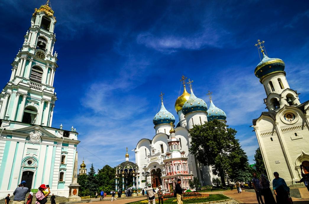 接著到謝爾吉耶夫參觀聖三一教堂,15世紀拉多涅日的聖謝爾蓋,在這裡建立了謝爾蓋聖三一修道院 。他在宣揚俄羅斯東正教的同時,聯合俄羅斯各大公,共同抵禦蒙古軍隊的入侵。據說當時就是因為他的祈禱,俄羅斯軍隊第一次戰勝了蒙古軍隊,此後他繼續宣揚東正教,成為俄羅斯東正教的聖者;修道院則被16世紀修建的城牆圍起來,城內有14-18世紀修建的眾多教堂,各幢建築各有不同的造型及色彩,卻又是那麼協調,搭配藍天白雲,令人驚艷。位於大修道院中央的聖母安息大教堂,是在伊凡四世命令下建成的,完成於1585年。在4個洋蔥頭形的藍色圓頂中央,有一個金色的大圓頂,看起來有點像王宮,教堂內有17世紀的壁畫。