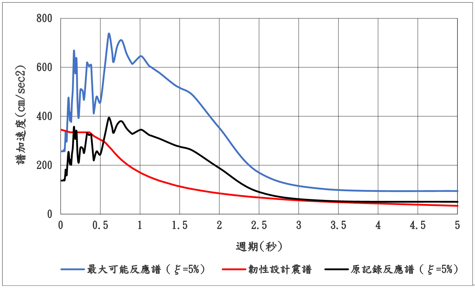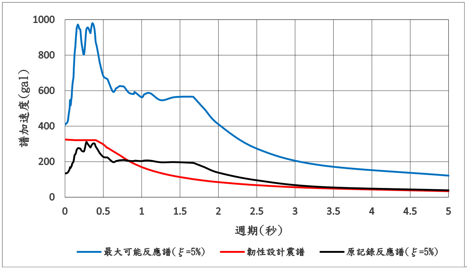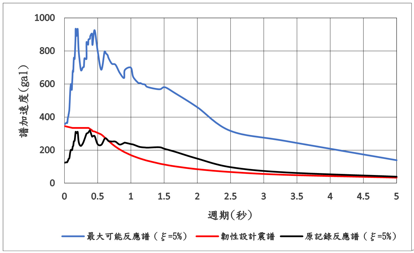 圖1~3分別是舊市區、安南區及永康區,美濃地震反應譜與韌性設計震譜的比較,其中地震反應譜,包括最大可能地震反應譜及原記錄地震反應譜;而此處的地震反應譜,是各區域內不同測站地震反應譜的平均值,且韌性設計震譜假設配合普通地盤。