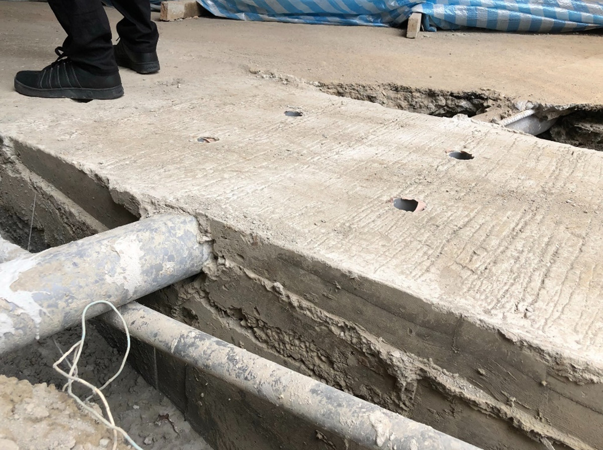 (二)潛藏瑕疵:1.由照片1可見,管線頂部之水泥混凝土披覆厚度未達1公分,且該部分之材料僅為水泥砂漿,未具水泥混凝土應有之粒料級配規格;2.因管線上方之水泥砂漿披覆厚度不足,當其表面承載應力後,水泥砂漿極易衍產生裂縫及剝脫,造成管線外露情事;3.披覆部分之材質,設計採用水泥混凝土,施工時卻使用水泥砂漿,有不符規定之虞。