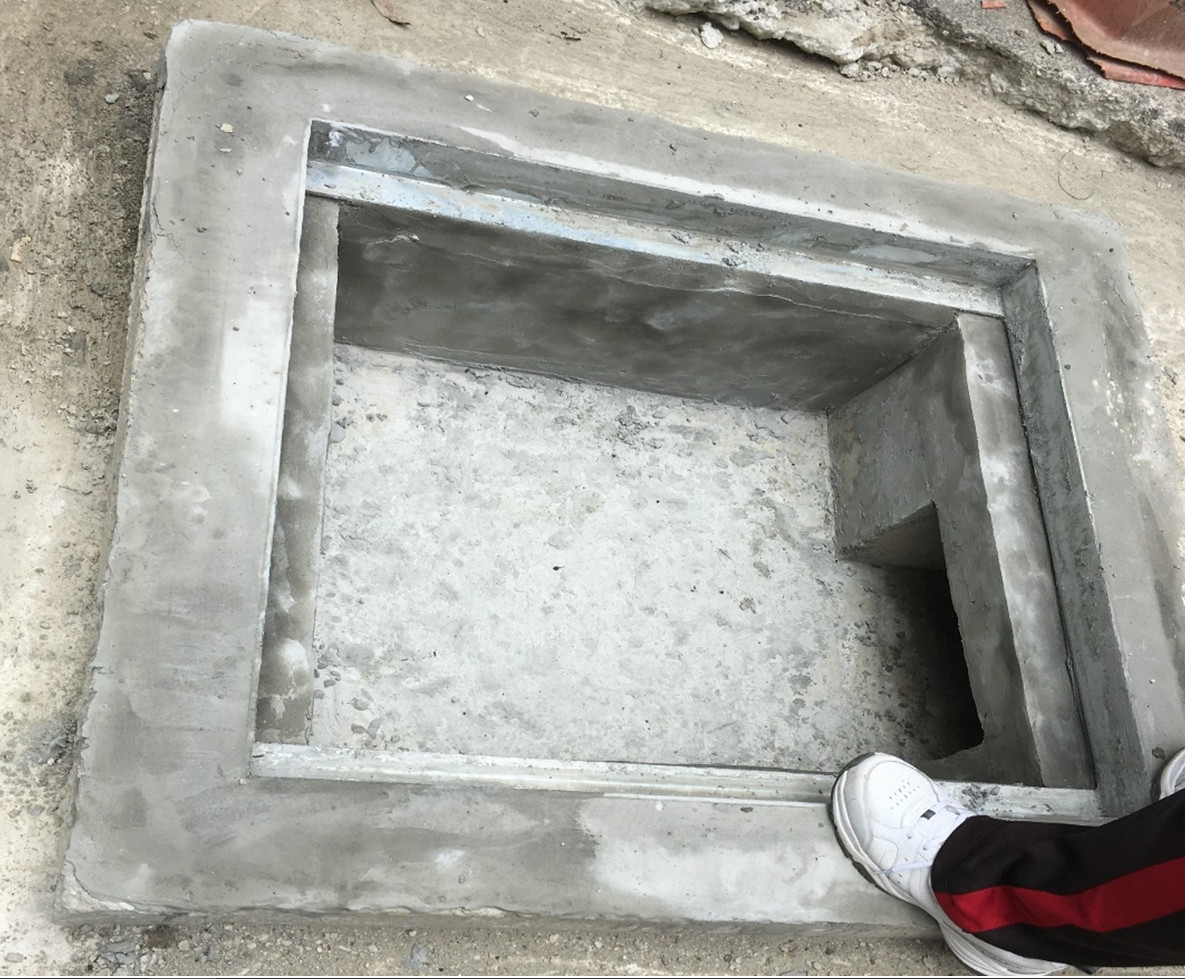 | 照片1 管線頂部使用水泥砂漿披覆, 厚度未達1公分 | | 照片2 集水井未施作收集排水槽井措施 之狀況 |
