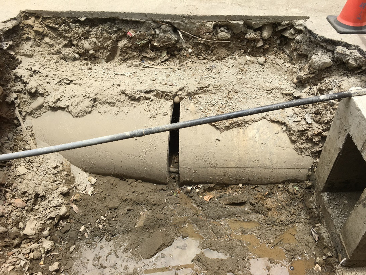 (二)潛藏瑕疵:1.不論該涵管係排放污水、雨水或是飲用之自來水,由涵管銜接處之開裂狀況研判,任何流水均會由開裂處滲出,進而嚴重掏空地下土壤層而造成鋪面崩陷;2.續由銜接處判斷,該兩段涵管在原始施工時,即未設置接縫措施,且亦未作防止滲水的處置。