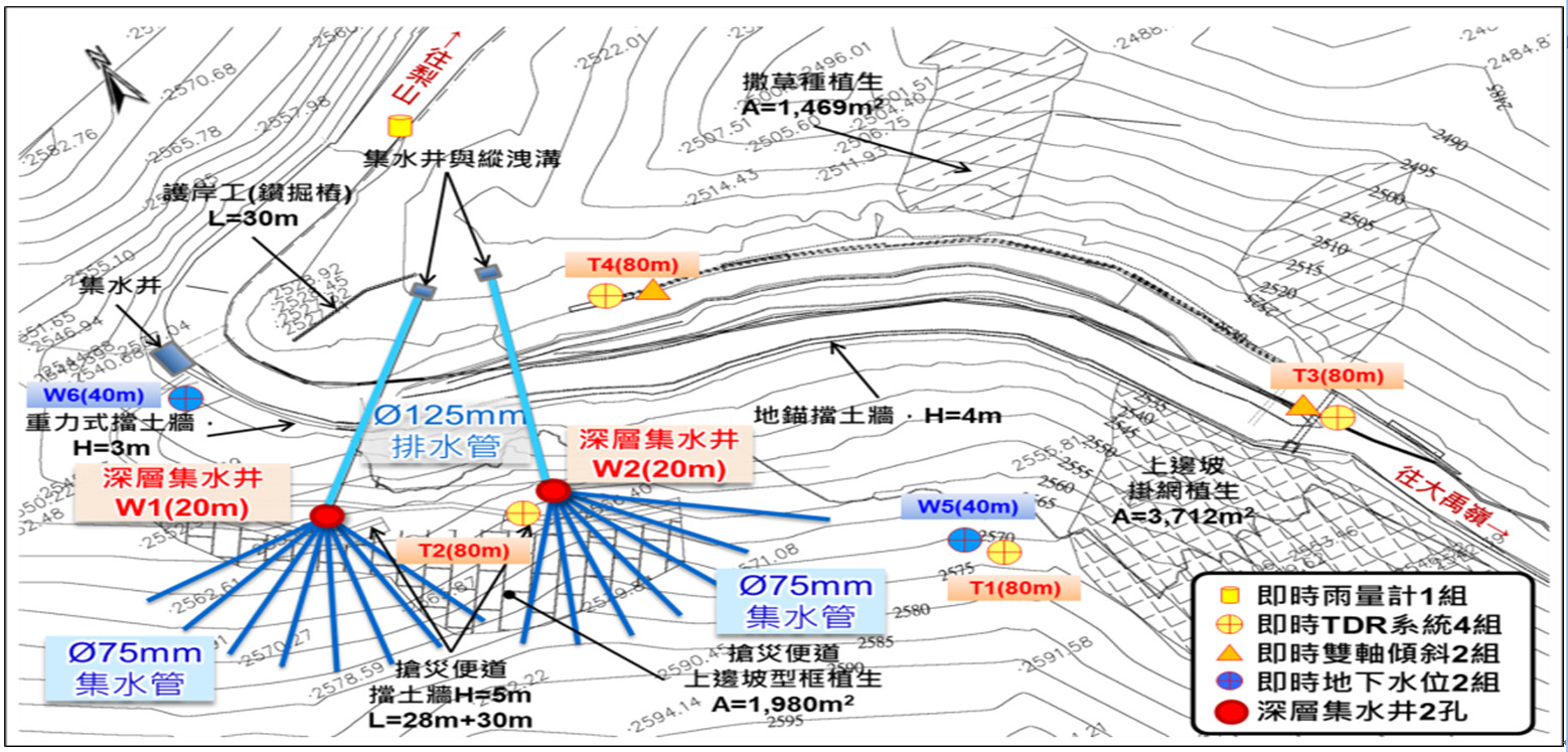 台8線109k+500,位於合歡北峰東側,海拔約2,600公尺,依據空拍影像調查,邊坡上方裂隙,因歷年之颱風、豪雨事件逐漸發育,106年0602豪雨時,距離道路水平約200公尺處發生崩落崖,高差約10~20公尺,詳圖2。邊坡崩塌災害範圍:水平距離350公尺,高差達270公尺,面積約8ha。災害造成道路擋土牆開裂、傾斜,地錨損壞,排水側溝遭剪斷,路基大量流失,道路中斷。災害第一時間,經緊急採用加勁路基搶修後,恢復通車;其後,經方案評比,採用2座深層集水井(直徑4.5m、深20m),導排邊坡地下水,搭配截流及型框植生工法等護坡工程,短期提升道路通行安全,工程佈置,詳圖3;工區施工相片,詳圖4。本文就高風險工作項目之深層集水井所涉之侷限空間作業,闡述落實安全作為之策略及作法;施工期間高山低温路段施工管理及勞工防護之機制,可另參本報1277期(110年5月29日)。