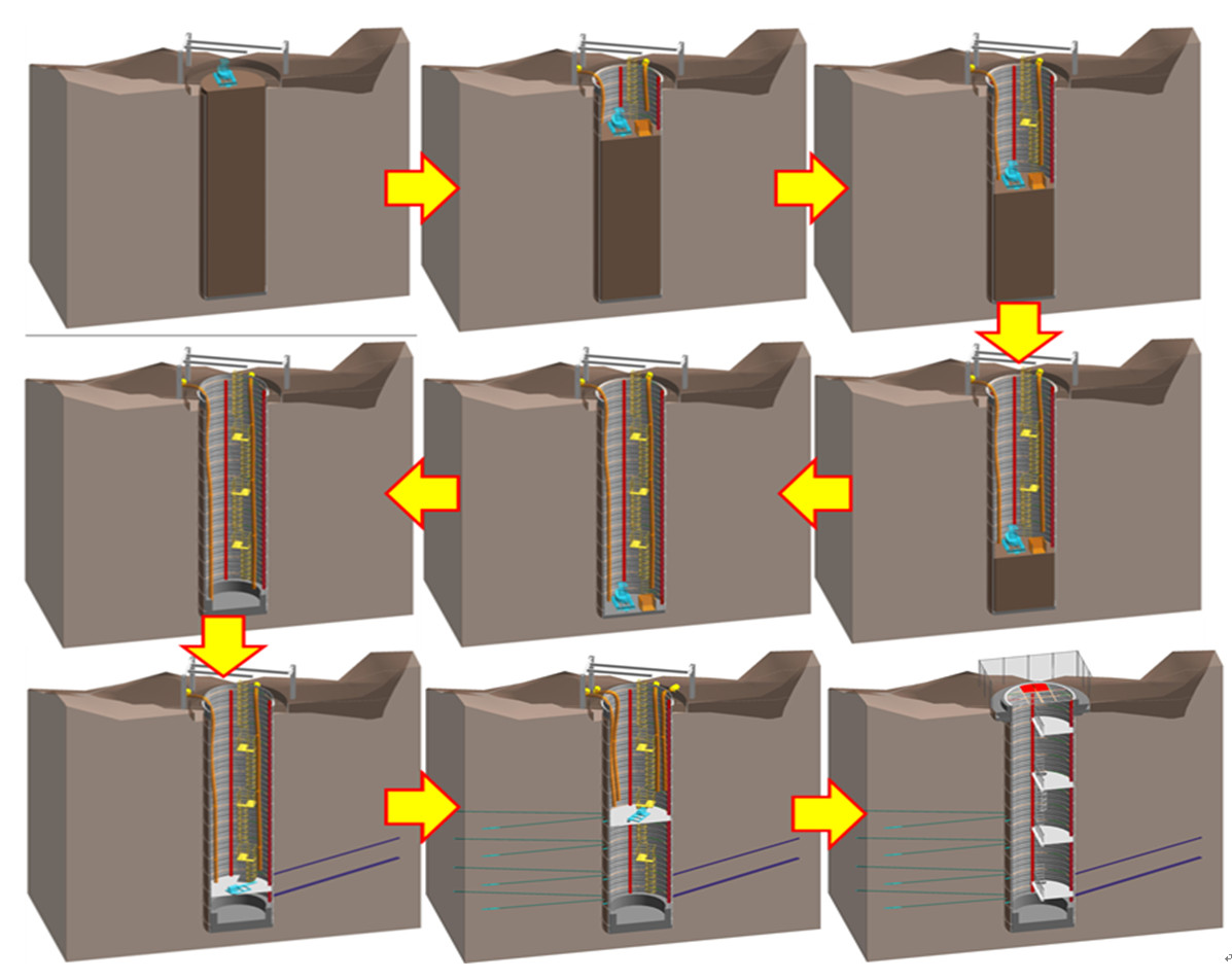 1. 設計及施工階段,皆採用建築資訊模型(BIM)解決衝突點,包含解決上下爬梯、通風設備、出土動線及施工機具之衝突;解決H型鋼、加勁肋梁及集、排水管位置衝突;解決營運階段洗孔機具及井內平台之衝突,詳圖5。
