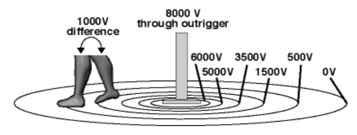當吊臂碰觸高壓電時,電流由支撐腳座、或擊穿輪胎,而傳導至地面。如果以土壤的構造與主要成份來說,土壤雖然含水唯其成分絕大部分仍都是非金屬物質,故單位面積內具有一定之電阻,使地面產生了電位差。雖然電工相關的設定,距離夠遠的位置來看,由於導電的面積夠大,都把地底當作電阻為零的接地位置;但從近距離來說,由於土壤有電阻的關係,從電流導入地面的接觸點開始,形成一圓形的環狀電位場(由地面下看則應為球狀),如圖1所示。這時在附近的人員,就必須注意所謂『步間電壓』感電的問題。