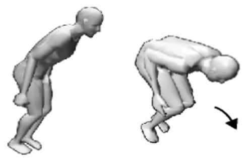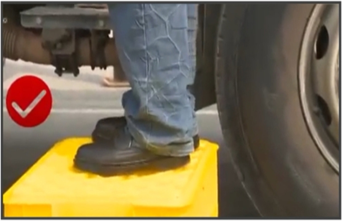 如果因故一定要跳車時,須注意以下兩個重點:第一、跳車的瞬間,身體務必與車輛完全分開。常見在一般狀況時,工人跳車為了身體穩定起見,常常一隻手扶在車上然後再跳下;但如果是在機具感電時,以這種姿勢跳下,腳在接觸地面時,剛好提供電流另一個良好的通路,因此常在跳下的那一瞬間,就遭嚴重的電擊而昏倒或死亡。第二、由於在機具的位置,也常是電位差最大的地方,跳車時盡量以雙手靠攏雙腳合併的方式,向遠離車體方向跳躍,如圖2。另外,如果衝力過大,落地後可以單腳交互跳耀的方式前進,遠離感電的設備。但請注意:跳耀時不可兩隻腳同時著地,跳躍的幅度不宜過大,以免重心不穩。在平時應該作為教育訓練的一環,讓工人練習。