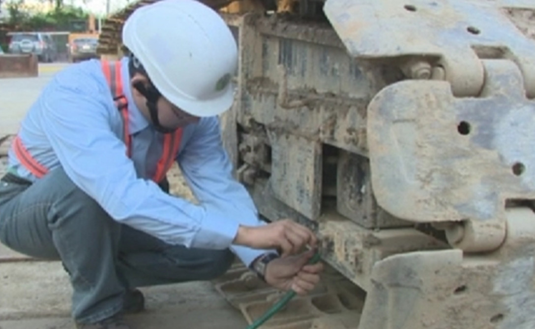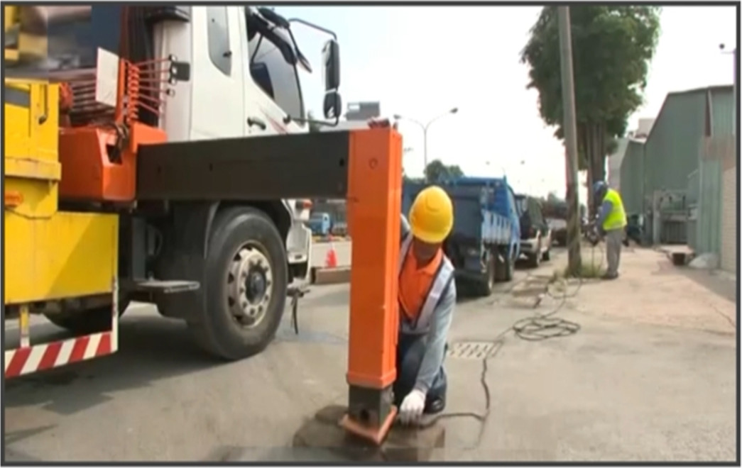 為了減低步間電壓的危害,第一、當然就是要避免發生感電的危險。如果要單靠操作人員目視去判定安全距離,絕對是一件非常危險的事情,因此一般需在吊臂等設備前方,設置專責的指揮人員。有時為了避免因光線問題造成誤判,例如陰雨或黃昏等,還會在地面上或容易注意的位置,做上或畫上參考的距離標記線,或設置限制架等。第二、在車上連接適當的接地線,萬一真的感電時,可以將能量盡量轉移到別的地方,自然可以降低步間電壓的問題,如照片6~7。一般可以將接地銅棒,打設於遠離施工區域的位置,或接於預先規劃的接地匯流排上。