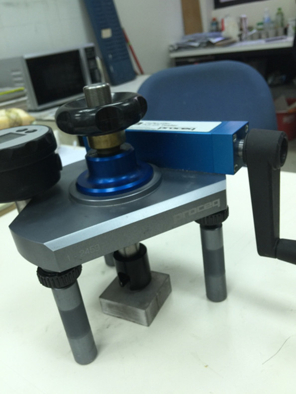 在第27天時,用砂輪機切割各3片的A及B二丁掛成4 cm X 4 cm和C二丁掛為5 cm X 5 cm,並在二丁掛表面以環氧樹脂黏貼拉伸接著專用鐵件。第28天做拉伸接著力檢驗,記錄最高荷重並計算接著強度,見圖5。
