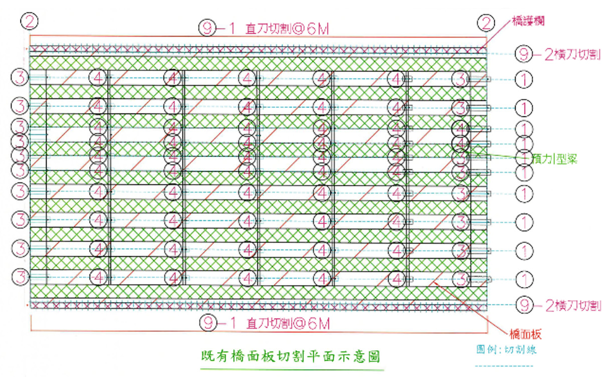(二)第二階段拆除北上線預力梁,共計12跨60支 1.南下線新橋懸臂版結構及中央隔欄設施完成後,並進行相關交維切換作業,封閉範圍為舊橋北上線全線為工區使用;將車流引導至南下線新建橋梁開放並維持之內側1車道供北上通行;外側1車道供南下通行。 2.將舊橋北上線護欄切割吊離及橋面板AC刨除後,進行橋面板及橫隔梁切割作業,將舊橋北上線4支預力梁橫隔梁切除,切割順序由P11往P23方向作業,橫隔梁切割由中央隔欄往下游側方向分階段逐支切割,並於橋面板切割或洗孔預留吊裝鋼索空間,以利吊裝鋼索穿鎖固定。 3.預力梁拆除吊離時,採兩部400噸吊車配置於北上線施工構台,吊離順序為由外往內之方向將預力梁(即編號9號梁往編號6號梁,詳圖8所示)依序拆除吊離,直至整跨4支預力梁拆除後依序進行下一跨拆橋作業。 4.預力I型梁逐支吊離至運梁板車後,駛離前往暫置區工區,再由施工便道上兩部吊車(200噸)接續將預力梁吊置於高灘地上進行分段拆解及破碎,並運棄至合法土資場處理。 5.預力I型梁拆除完成後接續拆除帽梁(詳圖9所示),並以鏈鋸切割分成三段(3M、3M、3M)拆除,並以200噸吊車吊運至運梁車上,運至暫置區採大鋼牙分解破碎,進行細部分解作業,並運棄合法土資場處理。 6.帽梁拆除完成後,接續拆除墩柱上半部(詳圖10所示),拆除方式如同帽梁拆除步驟。