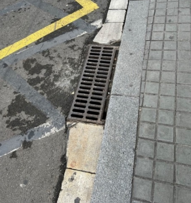 照片9 市區路邊側溝,清掃孔寬度小,減少占用道路空間, 邊線採用灰白色石材鋪設。 |