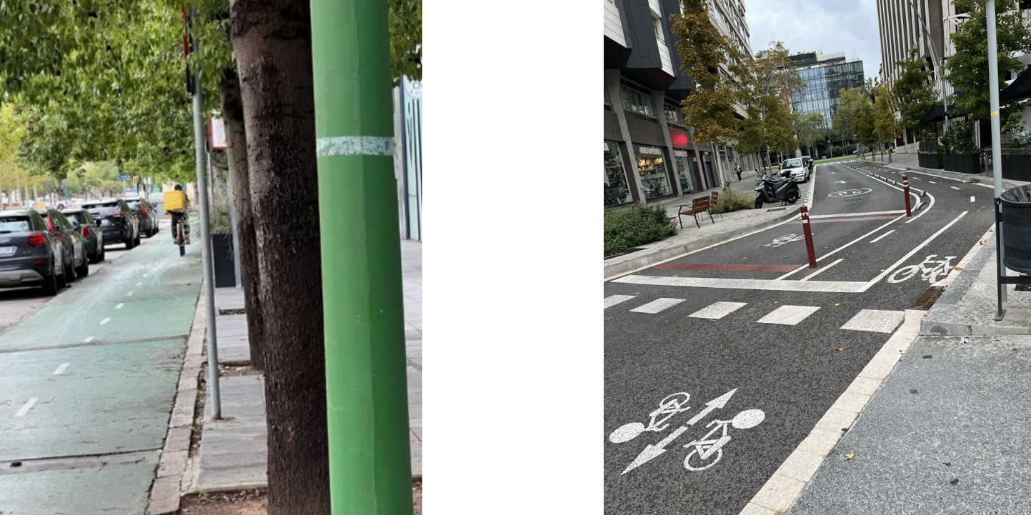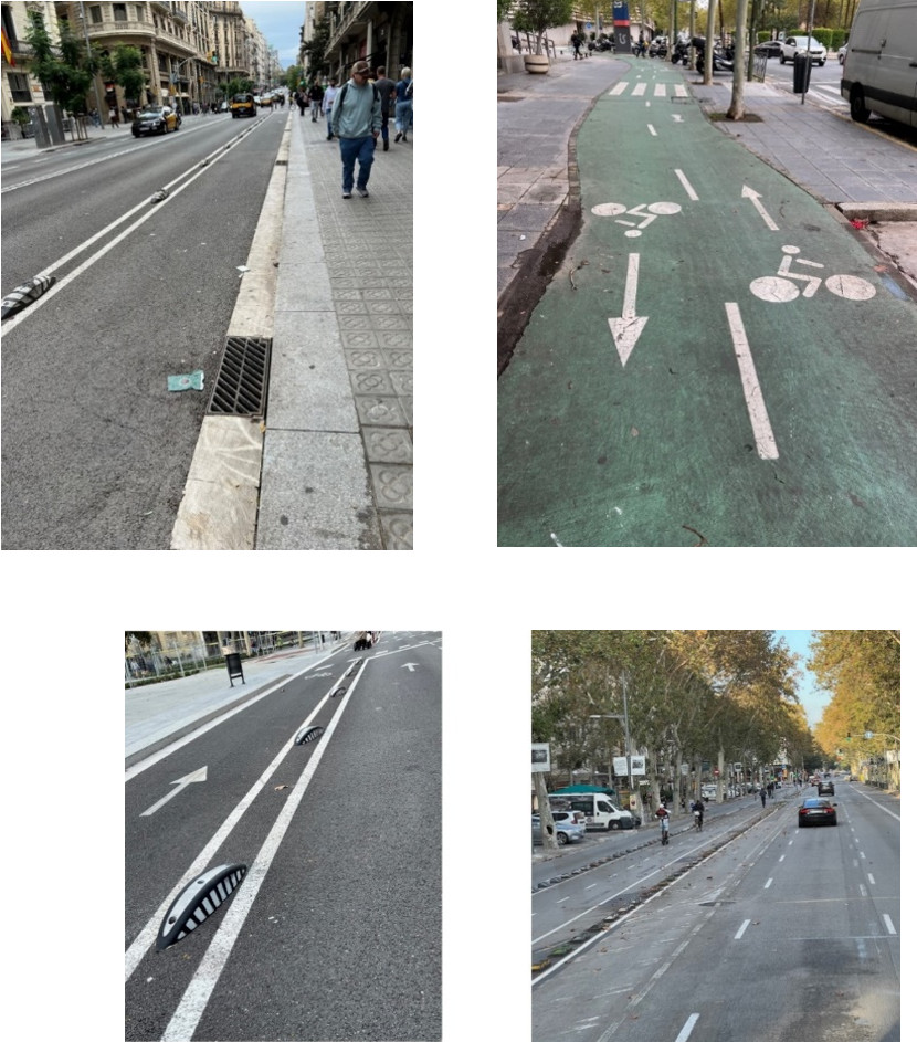 巴塞隆納的街道系統,顯見有劃設路邊停車位及未劃停車位兩種路型。其中劃設路邊停車位,又分為一般路邊停靠及人行道島頭圍束成「停車彎」停靠(照片10)。國內街道路邊車位配置,路燈、路樹等公共設施一般仍習慣整合於人行道上的帶狀設施帶(照片17),少見如巴塞隆納將大型回收桶置於車位前後的方式(照片7);國內街道的「停車彎」,則多數會將公共設施整合於與車格平行的人行道島頭內、以加寬內部人行空間(照片18),巴塞隆納的島頭則單純作圍束車格、作為分流功能。