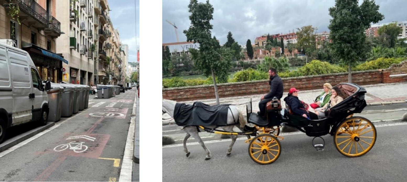 照片16 左邊照片住宅區,雖道路不寬,但資源回收桶仍到處林立, 普及資源回收,右邊照片西班牙南部第一大城塞維亞大力發展觀光, 搭乘馬車遊覽古城區,創造新鮮亮點。 |