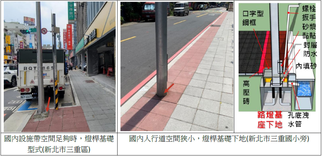 因氣候乾燥,多數巴塞隆納燈桿基礎均直接埋入人行道下方以減低通行障礙(照片11)。國內因氣候較潮溼,若人行道設施帶空間足夠,多數混凝土基礎會設置於人行道面上;然若空間狹小,亦會採用類似的基座下地方式,惟基礎會特別設計、考量排水(照片20)。