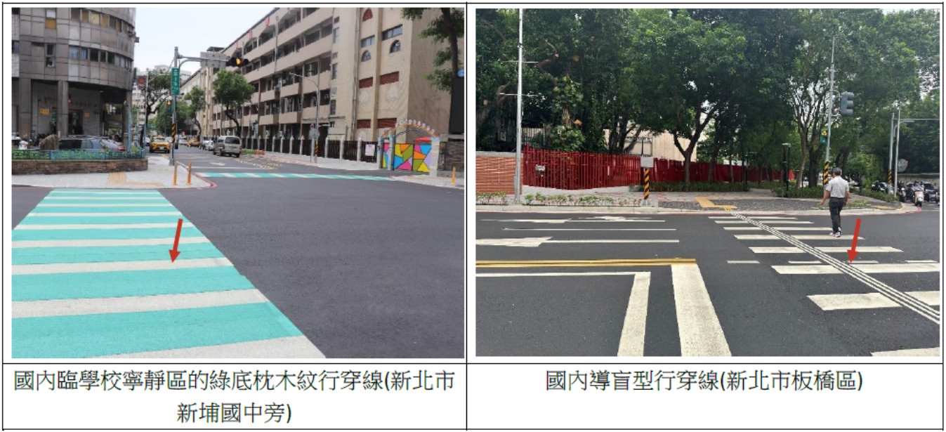巴塞隆納標線劃法與國內亦不盡相同,最明顯為行人行穿線,其採用兩側邊線引導保護、中間留白的方式(照片12);國內採用枕木紋行穿線引導,靠近學校交通寧靜區輔以綠底鋪面警示,近年則推行加劃縱向引導的導盲型行穿線(照片21)。