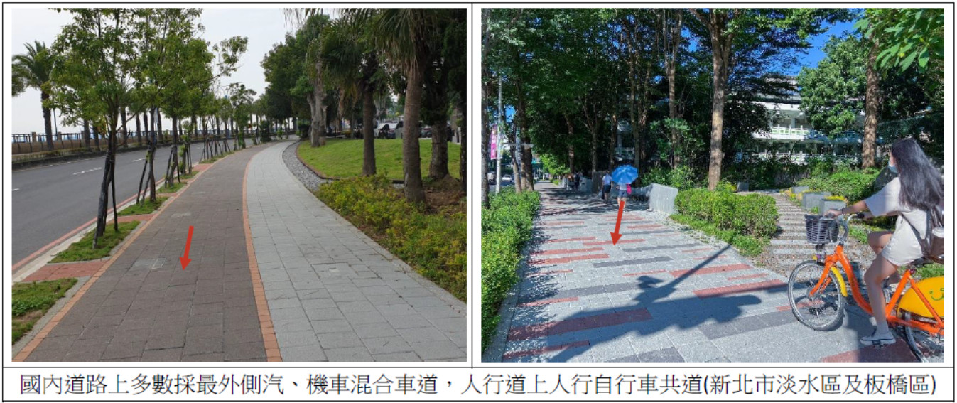 道路斷面配置涉及層面較廣,觀察巴塞隆納多數街道有條件使多元交通各有專用車道或共享車道(照片13);國內因氣候條件及用路習慣,多數交通工具為汽車、機車,自行車屬少數族群,故較常採用最外側的汽車、機車混合車道及人行道上的人行、自行車共道的配置(照片22)。