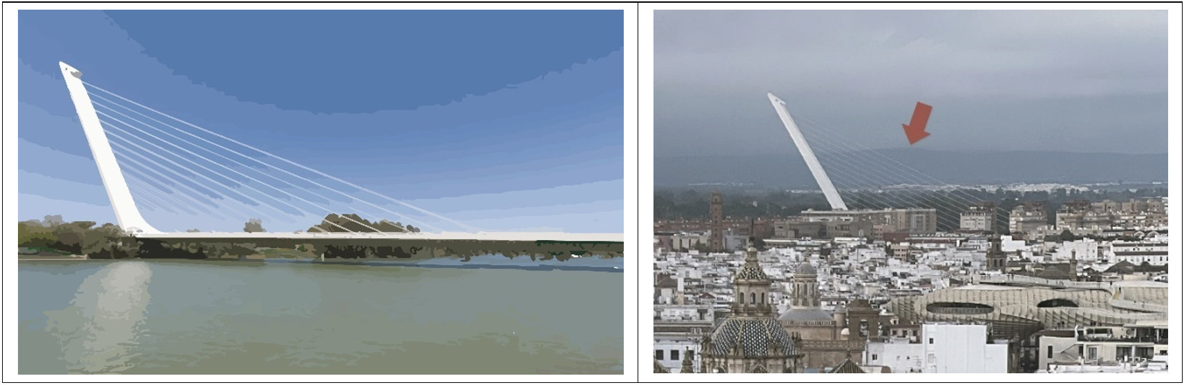台南市三爺溪文賢橋改建工程之文賢橋橋塔與此Alamillo Bridge橋塔相當神似,本橋橋長54m、寬15m,於2022年8月完工通車,橋梁型式為單斜鋼塔斜張橋,完工時距離西班牙塞維亞 Alamillo Bridge 1992年完工,相隔已30年(如照片3)。