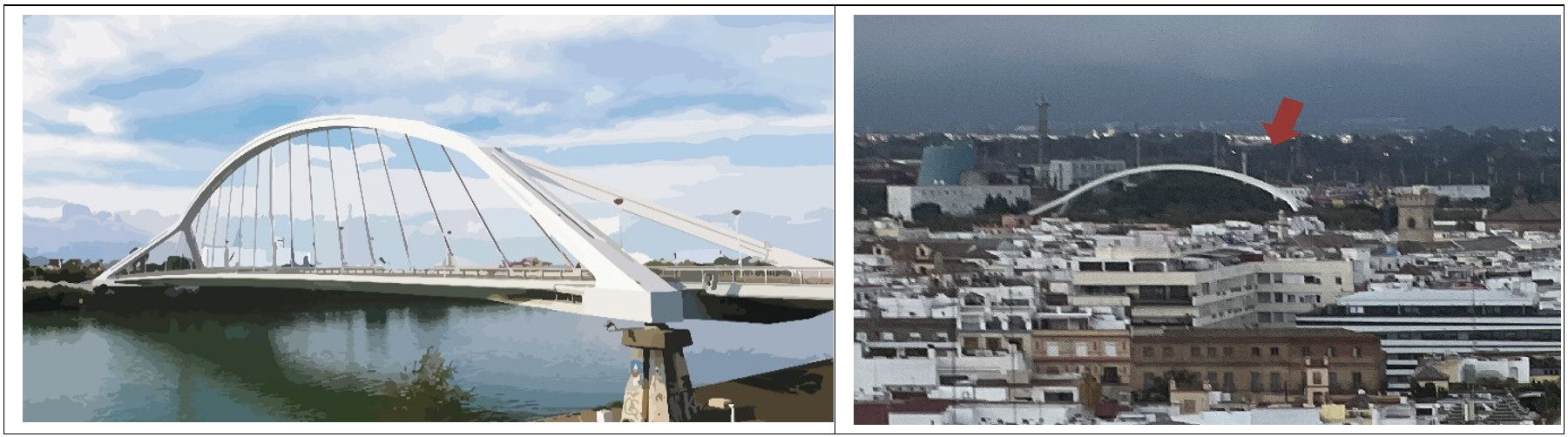 巴爾克塔橋(Barqueta‘s Bridge) ,全長214m、 寬21m,主跨徑168m,拱高28m,橋面中央設置17根鋼索,吊起橋面,1992年世界博覽會(The Universal Exposition Seville ’92 )在西班牙塞維亞舉行時興建完成。巴爾克塔橋(西語:Puente de la Barqueta)橫跨瓜達爾基維爾河的阿方索十三世運河。它是進入卡爾圖哈島的主要通道之一。始建於 1989 年至 1992 年,歷經3年,完工時正值 92 年世界博覽會之際,並被設定為該博覽會的主門。國內南方澳大橋(1998年完工)的橋型就是參考本座橋設計的,惟於2019年10月1日意外坍塌,已重新改建為V型橋墩大跨度混凝土懸臂梁橋,於2022年12月完工,筆者在塞維亞大教堂頂部鐘樓,遠眺城市,驚喜看到遠方這鋼拱橋白色的拱身(如照片4)。