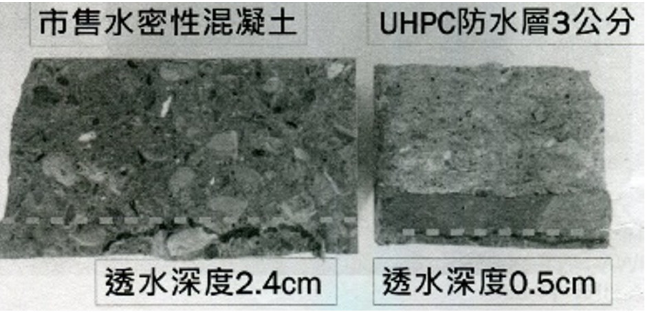 UHPC具有高流動性優異的抗拉與抗壓強度,可以抑制裂縫的特性,可以完全忽略侵蝕可能;抗磨蝕能力為傳統混凝土之7倍,與異質材料黏結性強,早期強度發展快;高黏結與握裹強度,適合用於補強材料與既有材料的接合,其高握裹強度可以縮短鋼筋的伸展長度;其超高的抗剪能力,即使不使用剪力鋼筋,仍可完全避免剪力裂紋,並造成撓曲降伏;其防開裂的優異防水特性,經由透水試驗結果,市售水密性混凝土透水深度為2.4cm,而UHPC 3公分防水層透水深度為0.5cm(詳圖2)。