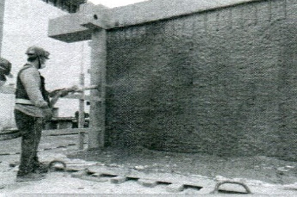 傳統營建工程的噴漿機即可適用,將拌合完成的UHPC漿體直接送入泵桶內,透過噴漿系統將漿體均勻噴佈在施作牆面上(詳圖5)。