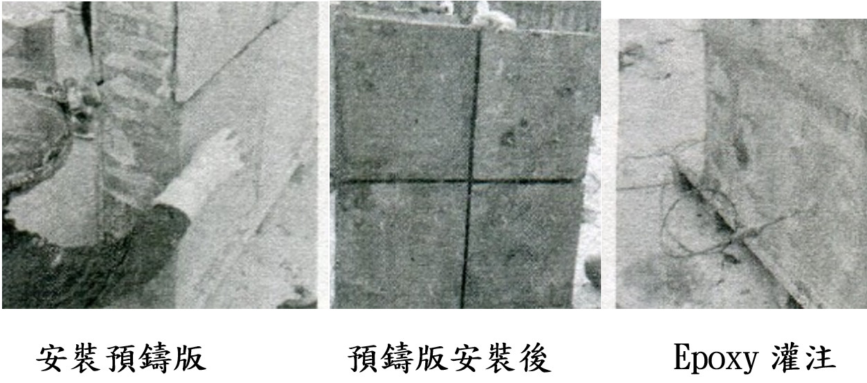 先將預先製作之UHPC薄版,以單片預鑄版為單位,以螺栓錨錠方式貼覆於牆體表面,其接縫以Epoxy灌注後即完成貼覆補強,屬半乾式施工方式(詳圖7),其施工過程為免拆模板。