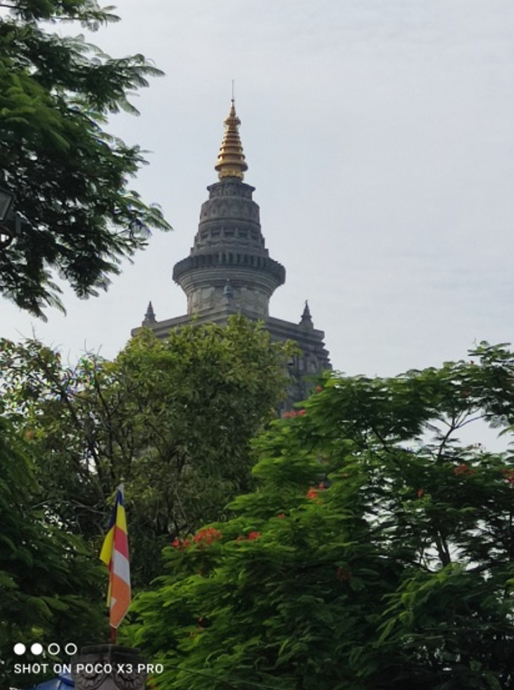 仰望菩提寺,頂部有金黃色的金頂(照片6),初以為是鍍金,經說明,據聞當時,菩提寺收到來自佛國的泰國,捐贈300公斤黃金,做為寺廟修建金頂而成。金頂可是用真正的黃金打造而成,加上了金頂的菩提寺,成為更臻完善的整體塔狀構造。