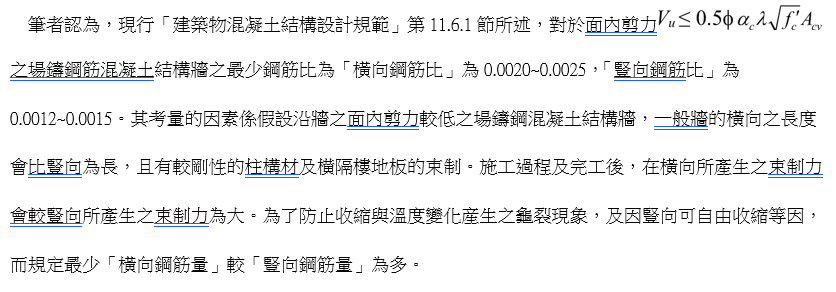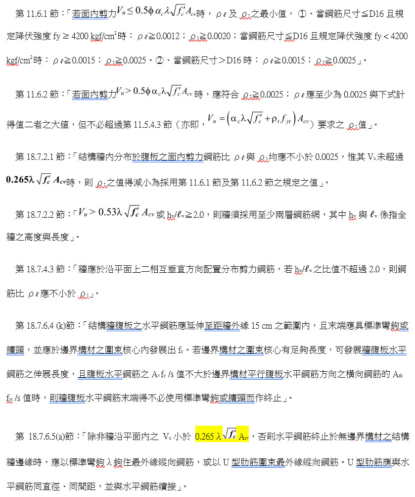 現行「建築物混凝土結構設計規範」對場鑄鋼筋混凝土牆配筋量限制之相關規定如下: