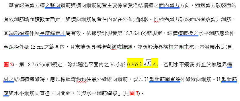 第11.7.4.1節規定:「若牆需依賴豎向鋼筋抵抗壓力,且豎向鋼筋Ast超過0.01Ag時,豎向鋼筋應受橫向箍筋支撐」。此處所謂「橫向箍筋」係指牆厚方向的橫向圍束箍、繫筋,圍束箍、繫筋須額外配置,除了須符合受壓構材箍、繫筋量及間距之規定外,因數量甚多,且施作耗時甚為麻煩。有技師認為『將剪力牆橫向鋼筋配置在外側,除了外側的橫向鋼筋有在內的豎向鋼筋作為支撐外,另外一個作用是橫向鋼筋在外側多少可以避免豎向的鋼筋挫屈』。但依據「建築物混凝土結構設計規範」第11.7.4.1節規定顯示,豎向鋼筋Ast不超過0.01Ag時,豎向鋼筋可配置於外側,且無需配置牆厚方向的橫向圍束繫筋;反之,須配置箍、繫筋防止豎向鋼筋挫屈。故橫向鋼筋配置在外側,豎向鋼筋配置在內側,未配合設置符合受壓構材箍、繫筋時,仍會產生同步挫屈,無法避免豎向鋼筋挫屈。豎向鋼筋一旦超過Ast超過0.01Ag時,豎向鋼筋可配置於內側或外側,但均須以箍、繫筋側撑才能防止豎向鋼筋挫屈(豎向鋼筋配置於外側之圖例見圖2及圖3)。