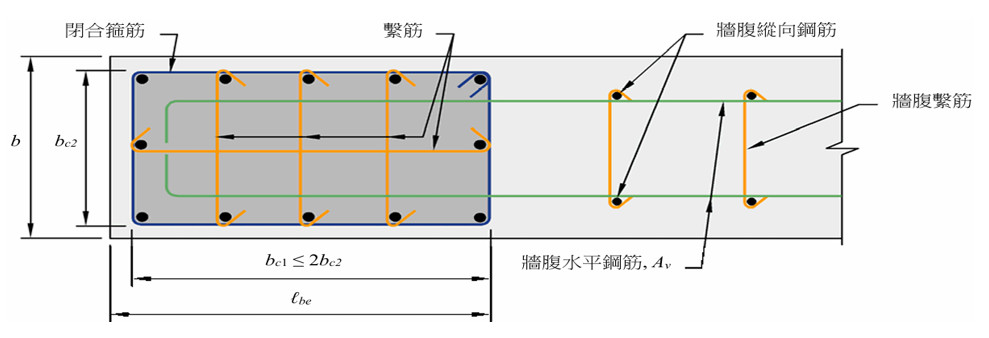 | 圖2 結構牆腹板橫向鋼筋應延伸至距牆外緣15 cm之範圍內,以標準彎鉤或擴頭錨定 |