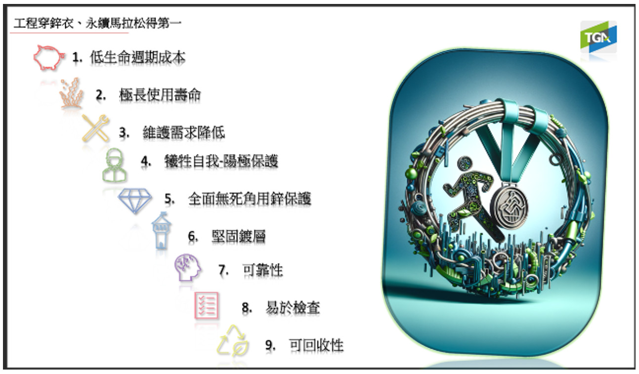熱浸鍍鋅這個百年工藝,我相信工程界的夥伴並不陌生。然而,熱浸鍍鋅對公共工程的防蝕效益,卻未必被全面理解。從圖1我們可以清楚看到熱浸鍍鋅所帶來的多重效益,遠超過一般認知與想像的: