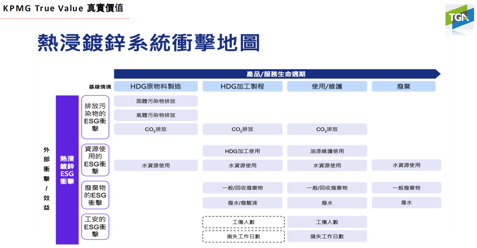 在總成本分析方面,透過熱浸鍍鋅系統的使用,可減少約65億元新台幣的成本支出(約65.3億元)。這個數據同時涵蓋了經濟及環境的衝擊。