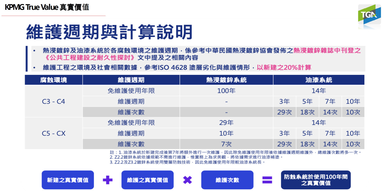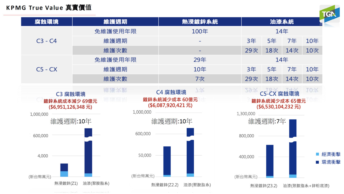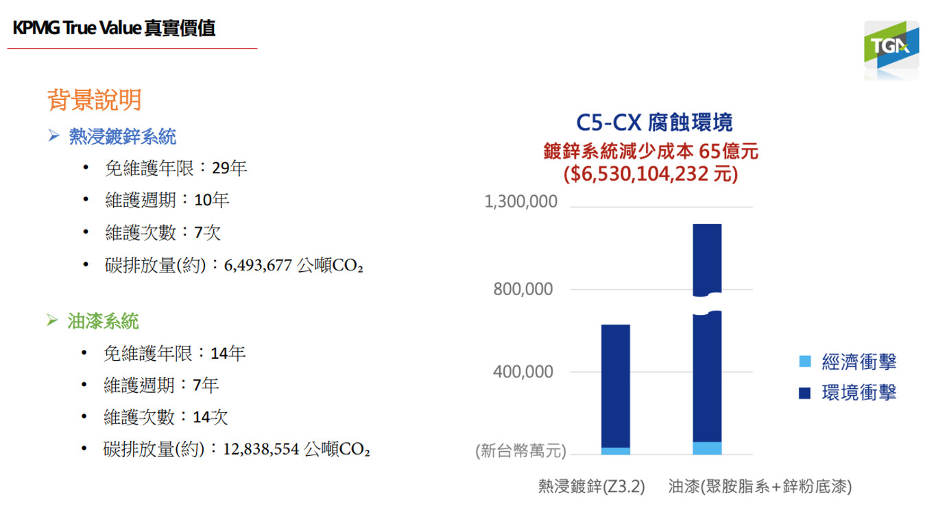 KPMG分析顯示,在C5-CX腐蝕環境下,熱浸鍍鋅系統比油漆系統減少約65億元成本及明顯降低碳排放。