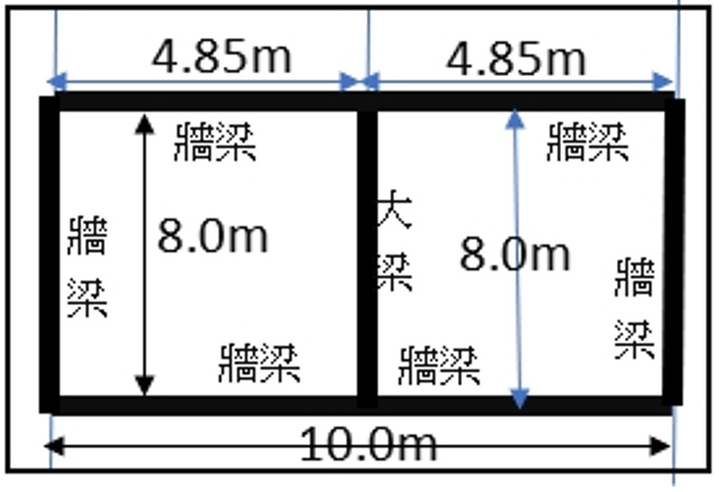 3..設氯倉之長 * 寬= 10 m*8 m,四周牆梁之尺寸為25 cm*50cm,一樓大梁之尺寸為35 cm *50 cm,則氯倉大梁承受頂板之面積A=(10-0.25)/2 * (8-0.25) =37.78 m2。設頂板之厚度 = 15 cm。