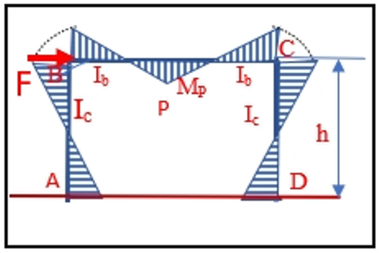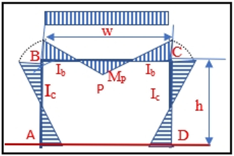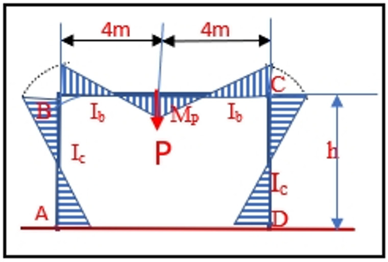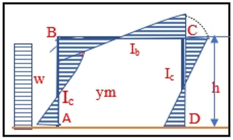 一樓大梁自重= 2.4 * 0.4 * ( 0.60 - 0.15 ) = 0.43 T。若加設之鋼梁採用300 mm * 300 mm *10 mm 之I型鋼, 其單位重量= 94 kg/m。I=20,400 m4。則一樓剛架承受之總重w = = 13.46 + 0.43 + 0.94 + 0.2 * ( 10 – 0. 25 ) / 2 ( 活載重 ) ≒ 15.81 T。柱自重= 2.4 * 0..5 * 0.5 * 3.6 (高) = 2.16 T。
