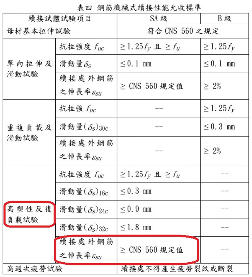 按照工程會「施工綱要規範」第03210章V4.0鋼筋-表四之規定,機械式續接器取樣試驗時,如採用SA級之續接器,在高塑性反復負載試驗時,允收之標準為伸長率必須大於CNS 560鋼筋材料之規定,詳圖1。而CNS 560-2005鋼筋混凝土用鋼筋-表12所規定之鋼筋伸長率,以常用之SD420W為例,依照不同試片,必須分別為12%以上或13%以上,詳圖2,對續接器的材質要求屬於高標準。內政部國土署(原營建署)之施工規範第03210章亦比照工程會之規定。