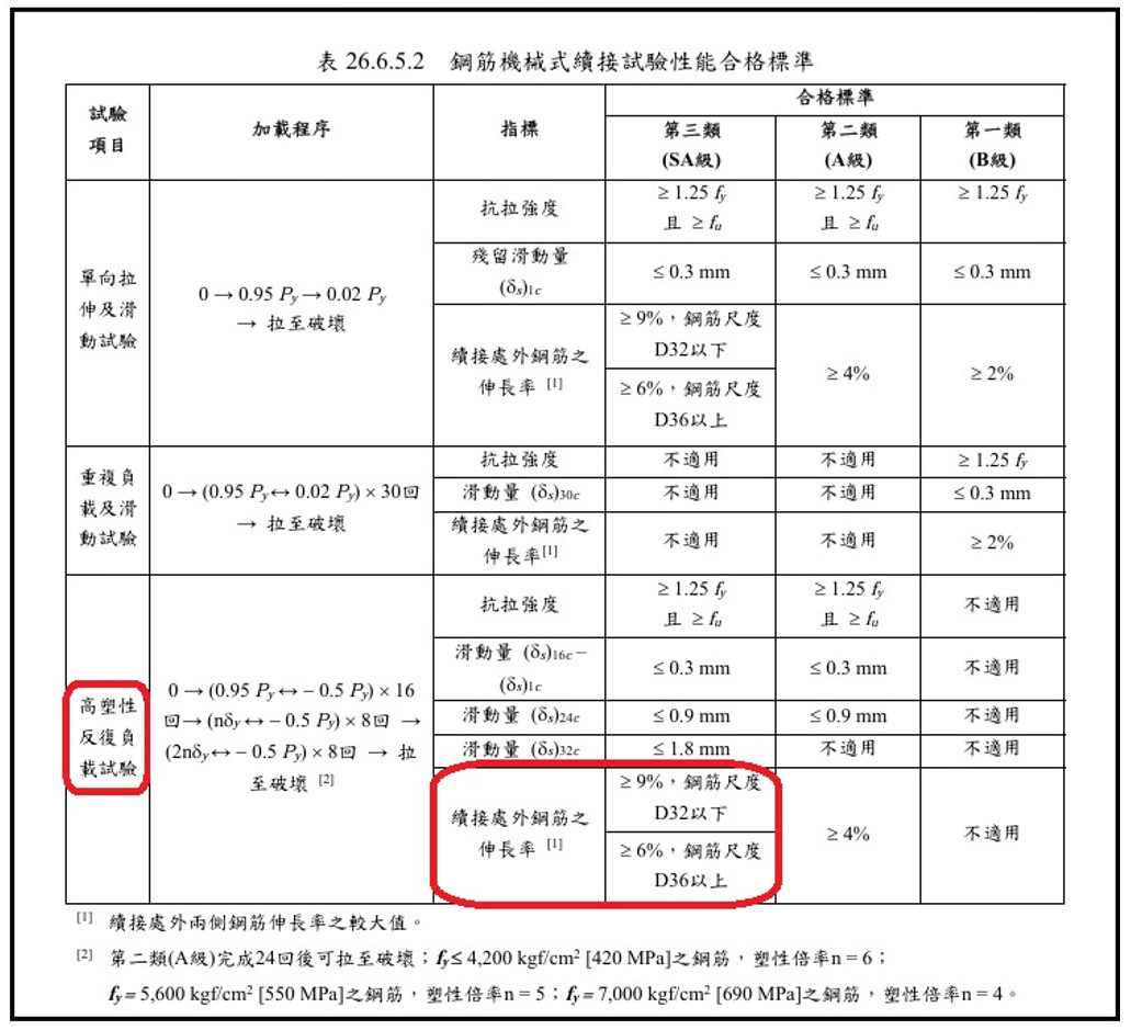 惟國內另外一份規範為內政部112年8月10日公告之「建築物混凝土結構設計規範」第26章-表26.6.5.2鋼筋機械式續接試驗性能合格標準,同屬SA級鋼筋續接器,其高塑性反復負載試驗伸長率之合格標準,依照鋼筋尺度之大小,則分別為6%以上或9%以上,詳圖3,與工程會之標準有明顯之落差。內政部之設計規範實乃源自中國土木水利工程學會之401-110規範。無論工程會或內政部之規範,其伸長率測試之數據係指續接處外兩側鋼筋伸長率之較大值。