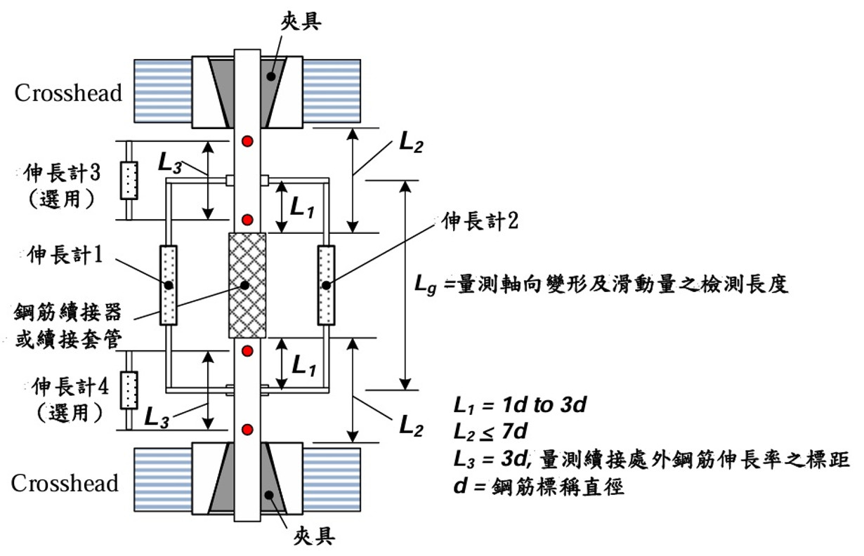 上述兩種規範之試驗方法均指定CNS 15560鋼筋機械式續接試驗法,其試驗裝置詳圖4。照常理,試驗室的試驗報告除應註明試驗方法之依據外,亦應該註明合格之「規範值」與實際「測試值」以供工程人員比對或判讀,可惜部分試驗室考量國內有不同之標準,其試驗報告均未列出規範值,只印出測試值,造成判讀困擾。