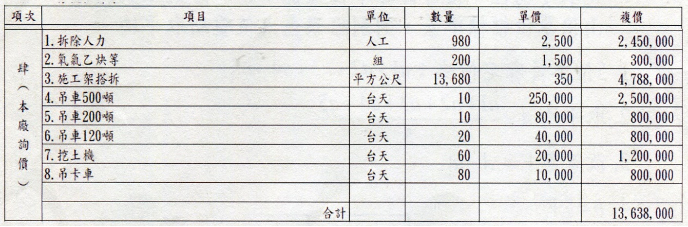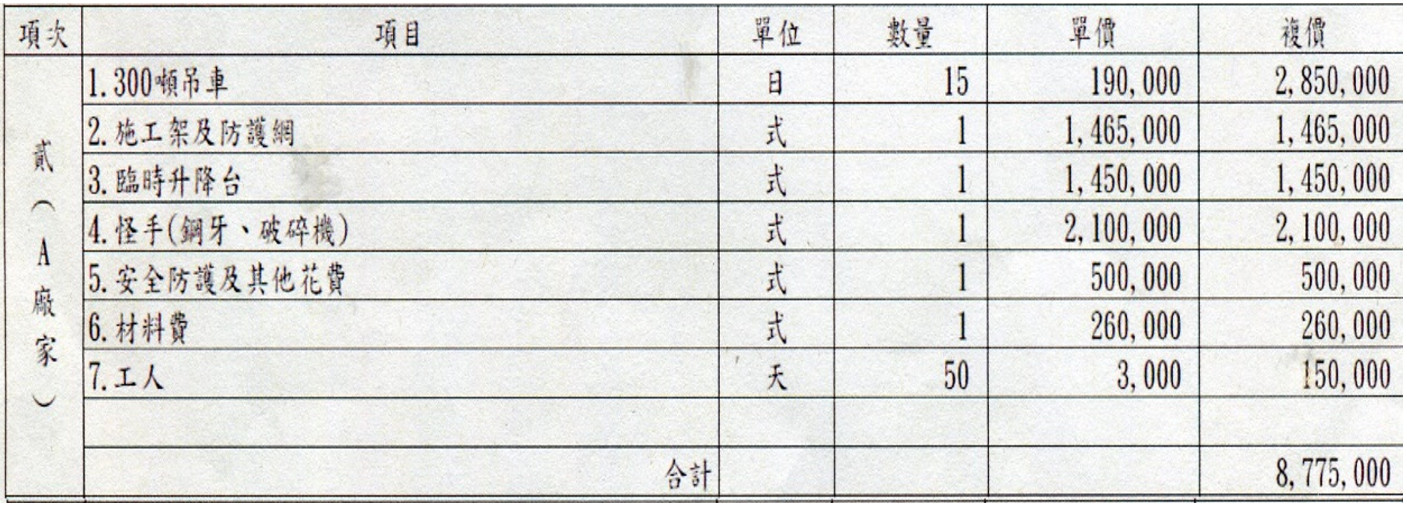 2.依政府採購法第63條第1項訂定之「採購契約要項第21條」及台電公司勞務採購承攬契約第十三條第3項規定,廠商須檢附二種不同工法之「規格、功能、效益及價格比較表」;就廠商提出煙囪一次性拆除及市場徵詢逐段式拆除工法價金,成立審議小組進行合理性審議。