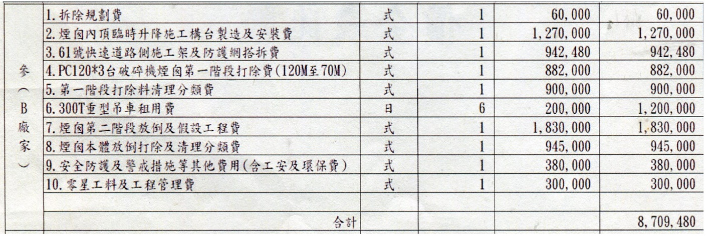 聆聽林口發電廠報告大綱及參考現場提供之契約相關資料後,筆者認為林口發電廠合理價金計算機制建議不符合現場實際施工情形,建議應以現場監造人員所見,以及工程日報每日記載事實作依據,以岡廷企業有限公司報價提出之「一次性拆除項目」作基準,按實際施工情況的出工、使用機具、工具、材料與數量、工作天數再乘以實際單價核算總價金才符合煙囪一次性拆除的實際工作情形。