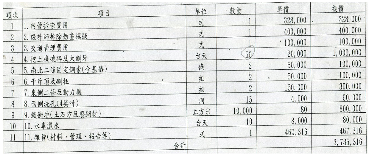 經在場的審議人員熱烈討論結果,一致同意逐項審議岡廷企業有限公司報價提出之十一項目作基準逐項審議計算價金,經總計後的價金為3,735,316元(詳表5),作為煙囪一次性拆除的合理價金。