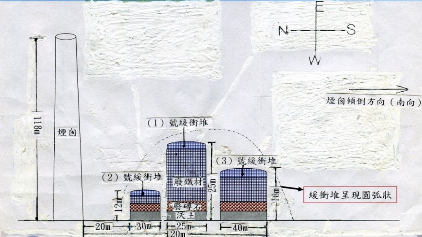 1.煙囪因地理位置與西濱快速道路間距僅10公尺(詳圖1),搭高架採重型機具在120公尺高空拆除將造成施工期程長及風險高,恐難獲交通部公路總局核准。