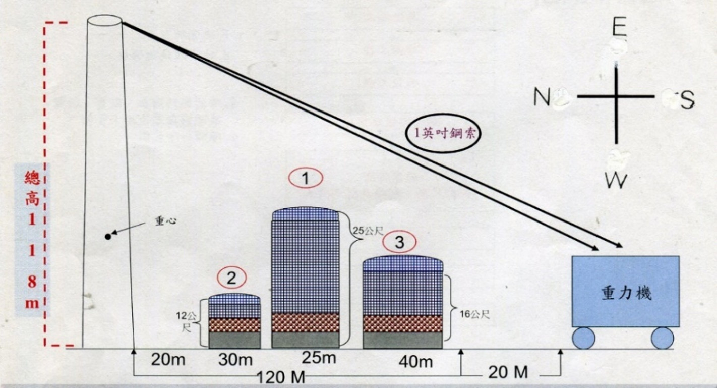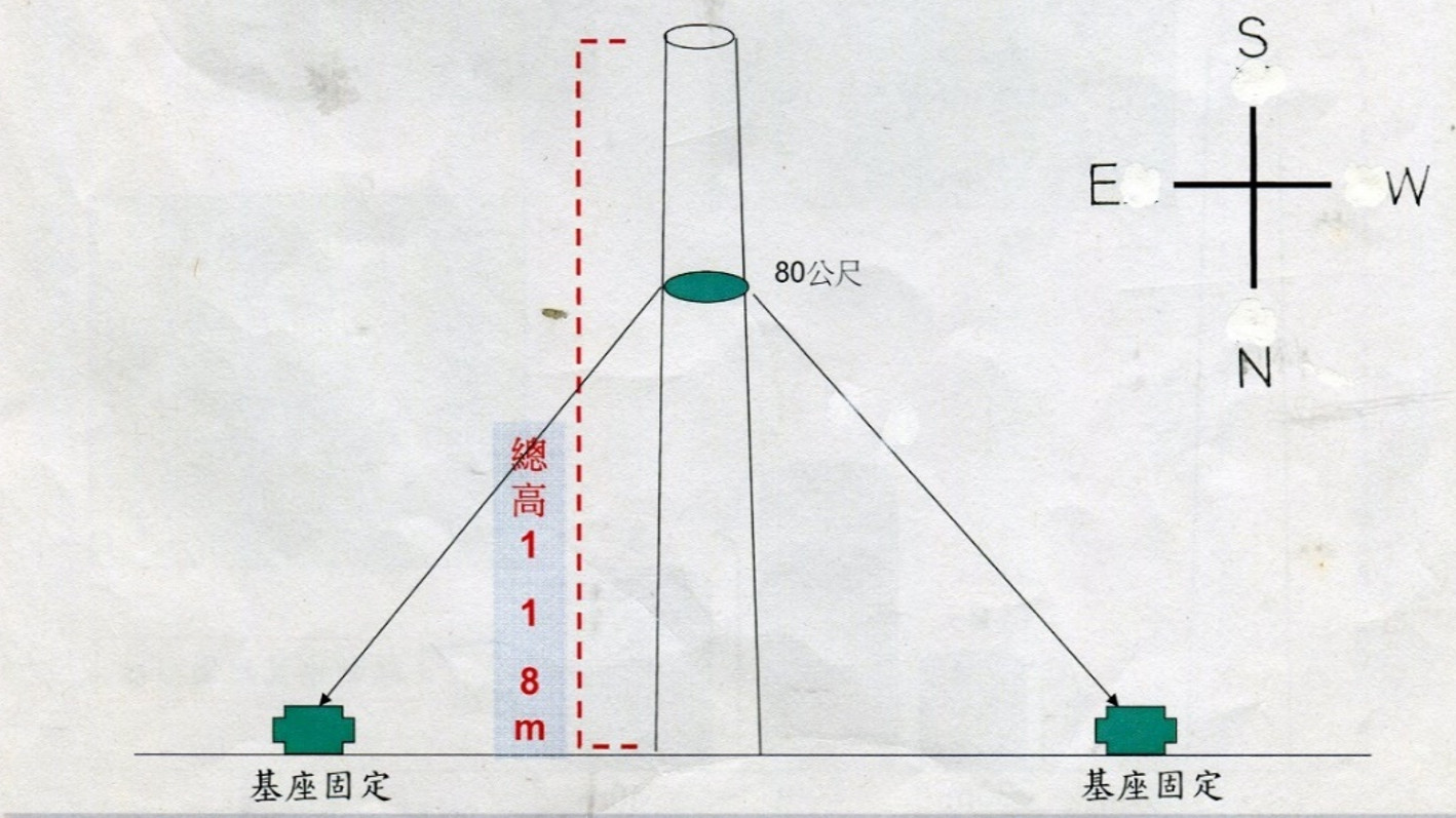 | 圖3 煙囪高80公尺東西兩側各加上一條直徑1英吋鋼索固定。 |
