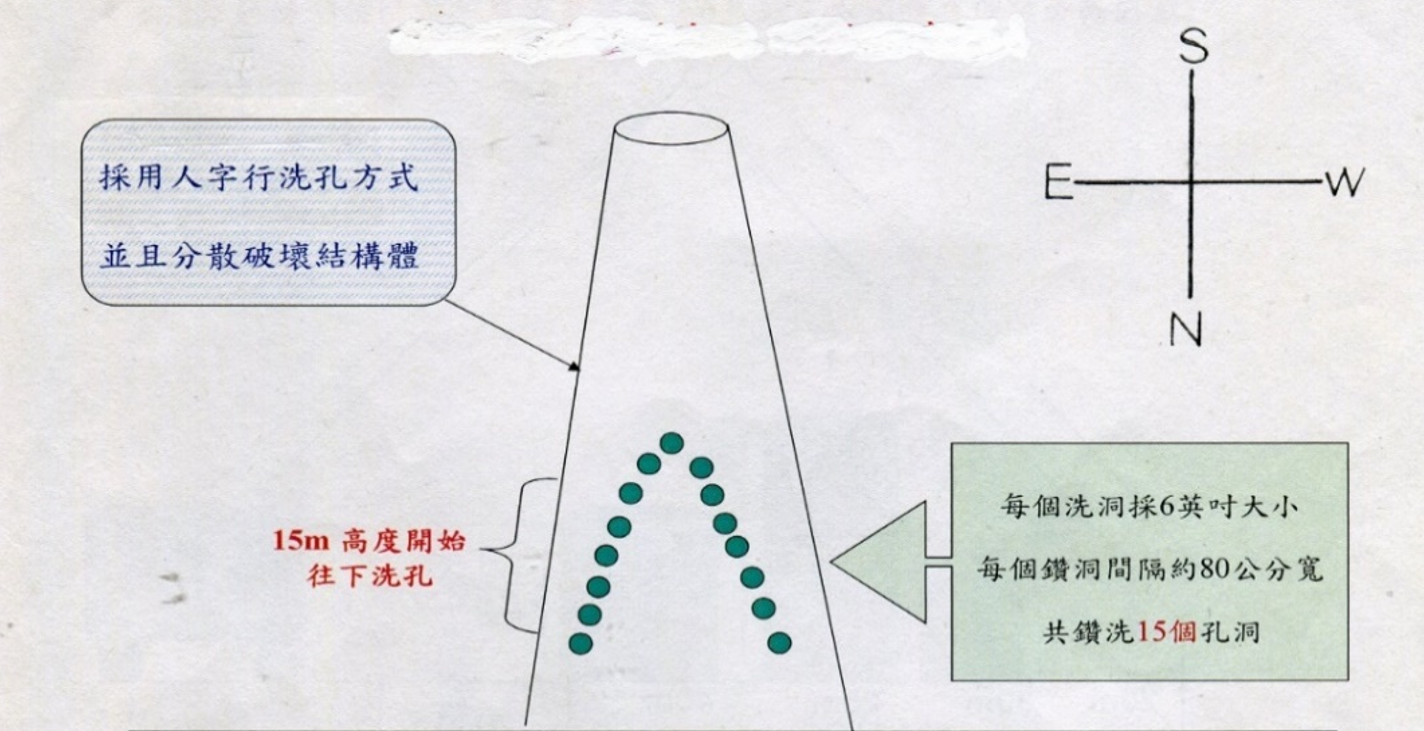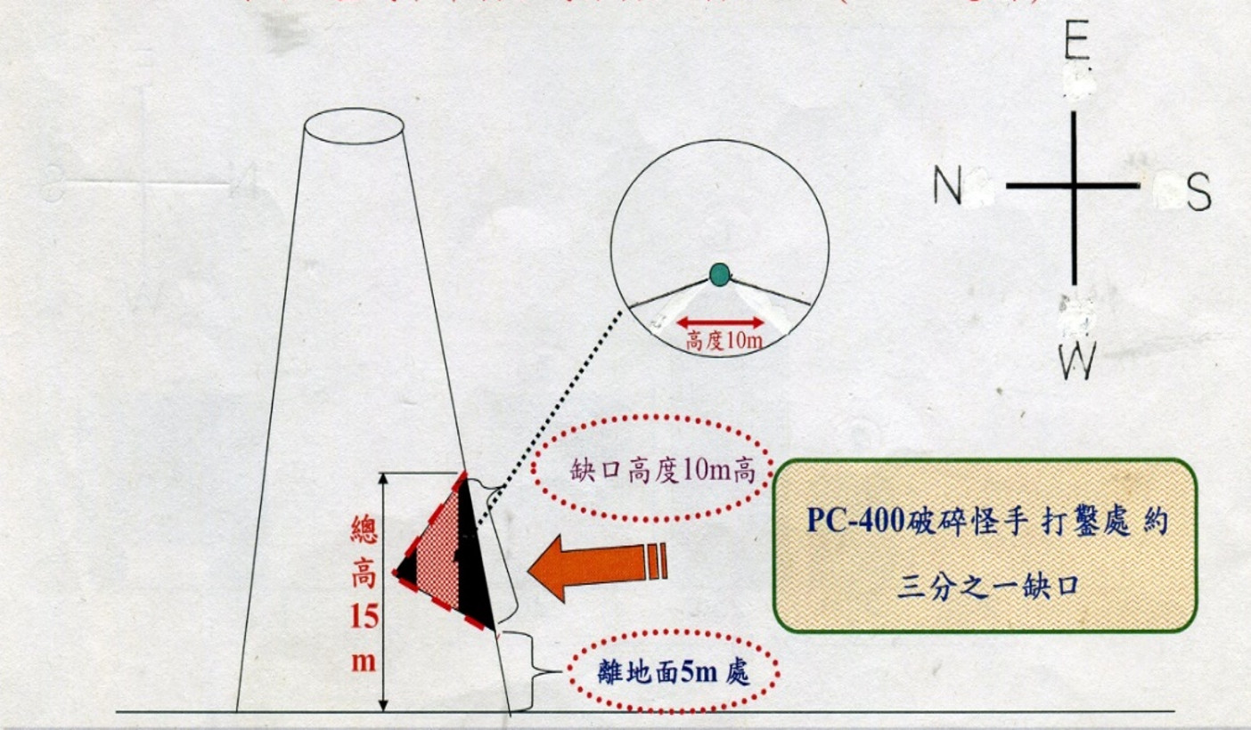 | 圖5 煙囪前方距地面上5公尺高處打擊3分之1缺口,用油壓式千斤頂方式頂住煙囪缺口。 |