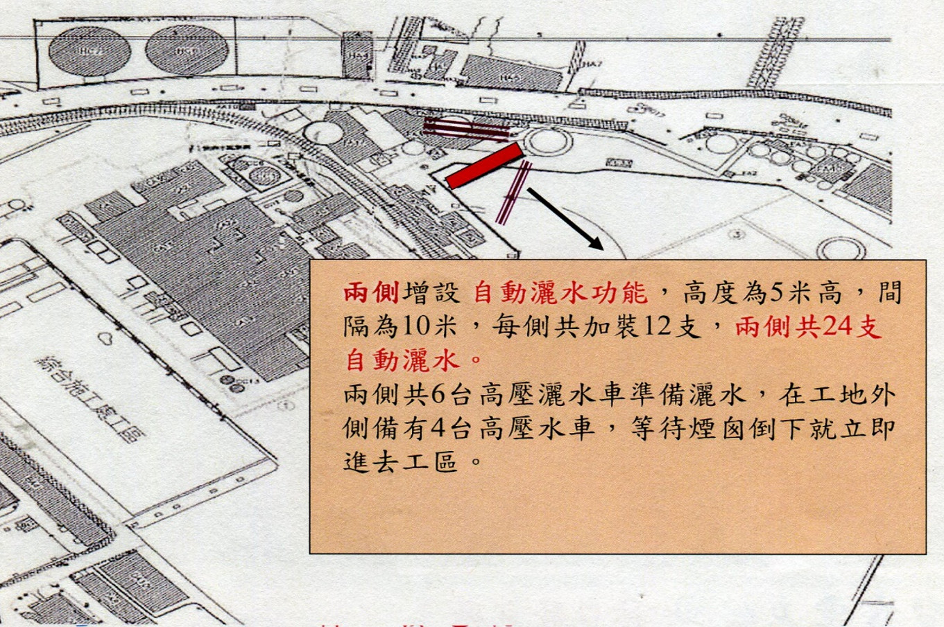 5.煙囪於重力機往南方下拉前,煙囪兩旁設自動灑水系統及高壓灑水車抑制拆除粉塵飛散:其佈置詳圖9。