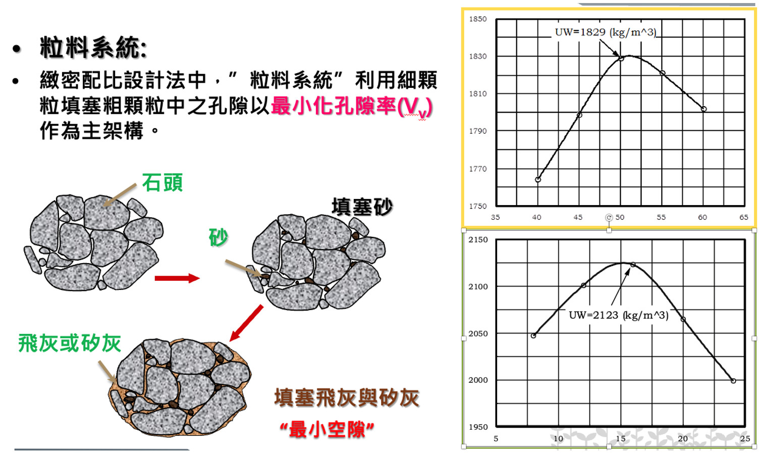 筆者團隊自1986年提出的緻密配比設計初步理論[ 1],是混凝土科學的重大突破。此後,陸續出版「混凝土性質與行為」、「高性能混凝土」、「卜作嵐混凝土使用手冊」等書,進一步詳述了緻密配比理論的應用與實務。緻密配比設計的核心理念,便是透過科學方法優化不同粒徑顆粒的級配,以實現最大堆積密度。目前更應用AI Agent,由大數據將物理緻密與化學強化功能及緻密堆積理論融入精密配比設計中,飛灰的用量可以提高,見圖1所示。
