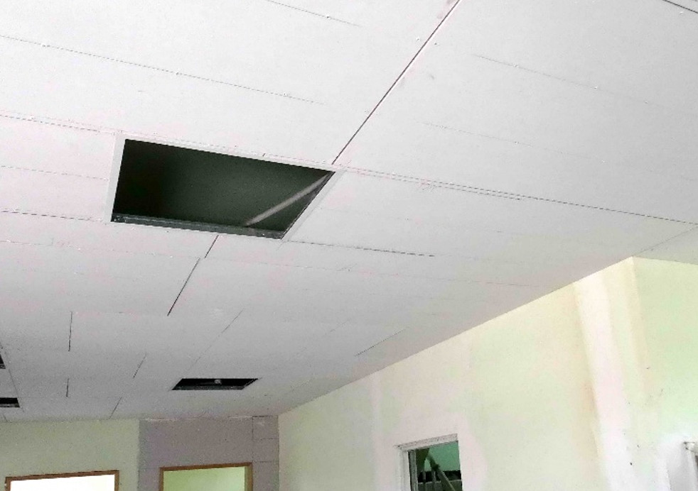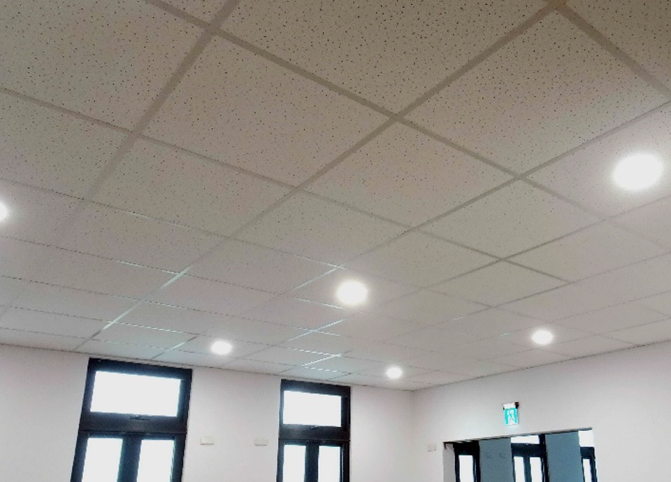 建築之室內裝修常用的天花板系統包括「明架系統」與「暗架系統」,分別如照片1與照片2。明架系統係將懸吊輕鋼架裝設完成後,再將天花板逐片裝入輕鋼架上方,為活動式之裝板,日後之檢查與維修非常方便,由於使用者可清晰看見輕鋼架之骨架,常被稱為明架天花板。而暗架系統則是將天化板釘牢於輕鋼架之下方,屬於固定式之安裝方法,使用時比較不容易掉落或鬆脫,安裝完成後只能見到接縫卻看不到輕鋼架,故常被稱為暗架天花板。