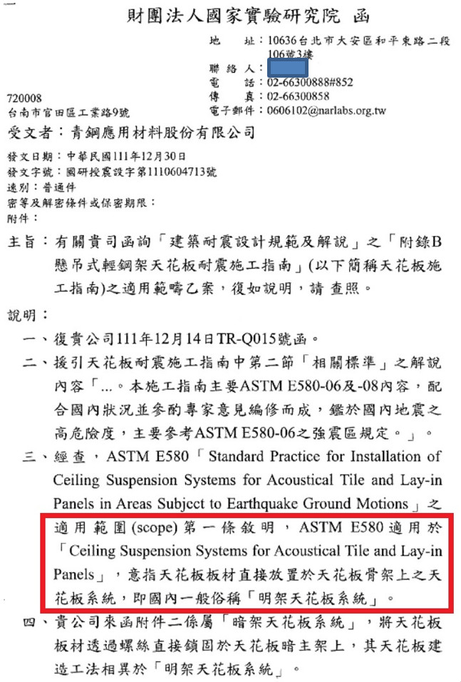 有關天花板之耐震設計,建築物耐震設計規範附錄B已有明確之規定,其詳細之內容筆者曾分別於技師報1172期與1348期撰文介紹。值得一提的是前述規範係抄自美規ASTM E580 地震區置入式平板(Lay-in Panels)天花系統之設置標準,此種規範之適用範圍是否涵蓋所有「明架」與「暗架」系統,常發生爭議,建築主管機關也缺乏明確之解釋。俟經研發單位「國家實驗研究院」發文定調該規範僅適用於明架系統,詳圖1。